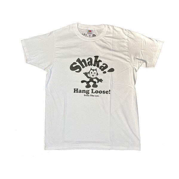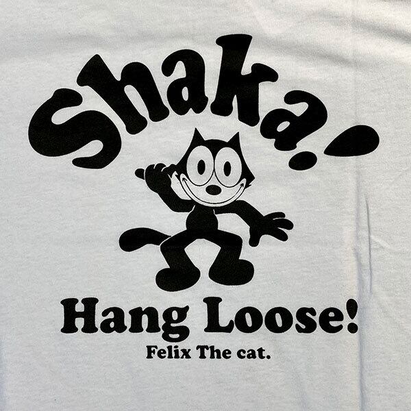ハワイではおなじみの SHAKA ハンドサインをしているフィリックスがフロントにプリントされた、Tシャツです。
