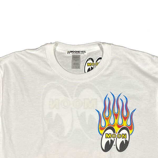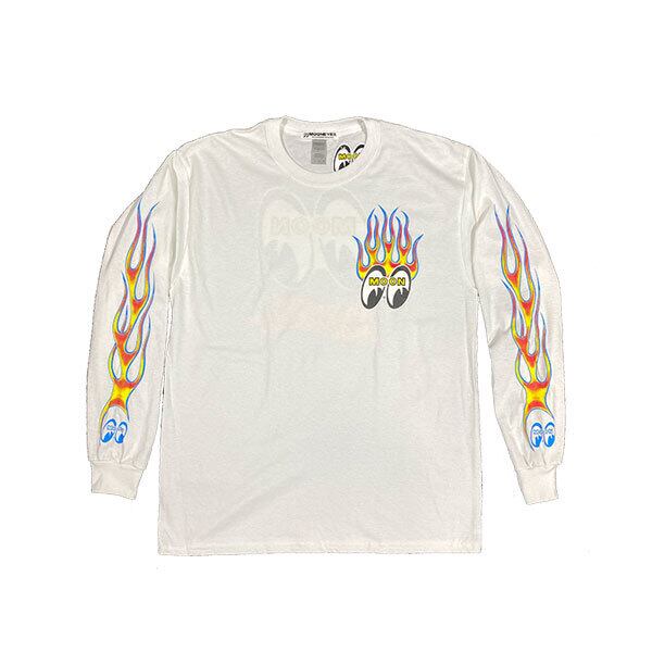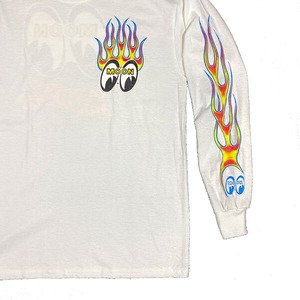 Flamin' MOONEYES Long Sleeve T-Shirt White フレーミン ムーンアイズ ロング スリーブ Tシャツ ホワイト 長袖 ワイルドマン石井 レタリング ピンストライプ HOTROD バイク MOONEYES ムーンアイズ