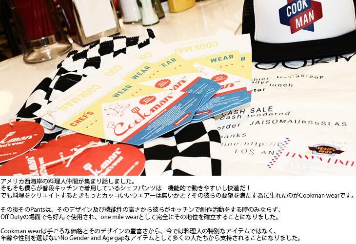 Cookman wearは手ごろな価格とそのデザインの豊富さから、今では料理人の特別なアイテムではなく、年齢や性別を選ばないNo Gender and Age gapなアイテムとして多くの人たちから支持されることになりました。