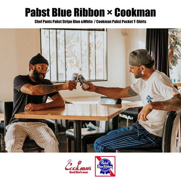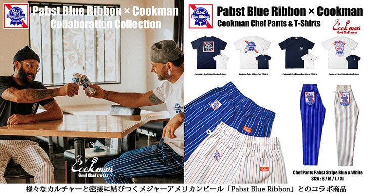 個性的なプリントが目を引くクックマンのシェフパンツと様々なカルチャーと密接に結びつくメジャーアメリカンビール「Pabst Blue Ribbon」とのコラボ商品