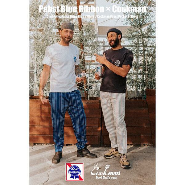 個性的なプリントが目を引くクックマンのシェフパンツと様々なカルチャーと密接に結びつくメジャーアメリカンビール「Pabst Blue Ribbon」とのコラボ商品