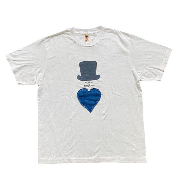 NEW LOVE & HAT PRINT DENIM PATCH T-SHIRTS WHITE ボヘミアンズ ラブ&ハットプリント デニムパッチ 半袖Tシャツ ユニセックス 日本製