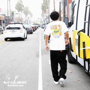 個性的なプリントが目を引くクックマンのシェフパンツ。